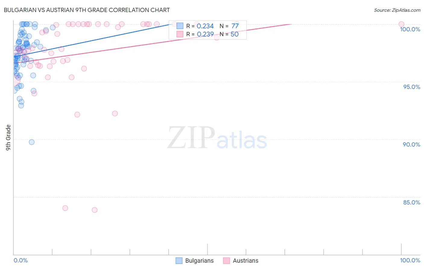 In terms of 9th grade, the demographic groups most similar to Bulgarians are Northern European (96.2%, a difference of 0.010%), Hungarian (96.2%, a difference of 0.040%), Estonian (96.1%, a difference of 0.050%), Immigrants from Scotland (96.1%, a difference of 0.050%), and Ottawa (96.1%, a difference of 0.070%). Similarly, the demographic groups most similar to Austrians are Serbian (96.0%, a difference of 0.010%), Immigrants from Canada (96.0%, a difference of 0.010%), Immigrants from Northern Europe (96.0%, a difference of 0.020%), Celtic (96.0%, a difference of 0.030%), and Greek (96.0%, a difference of 0.040%).