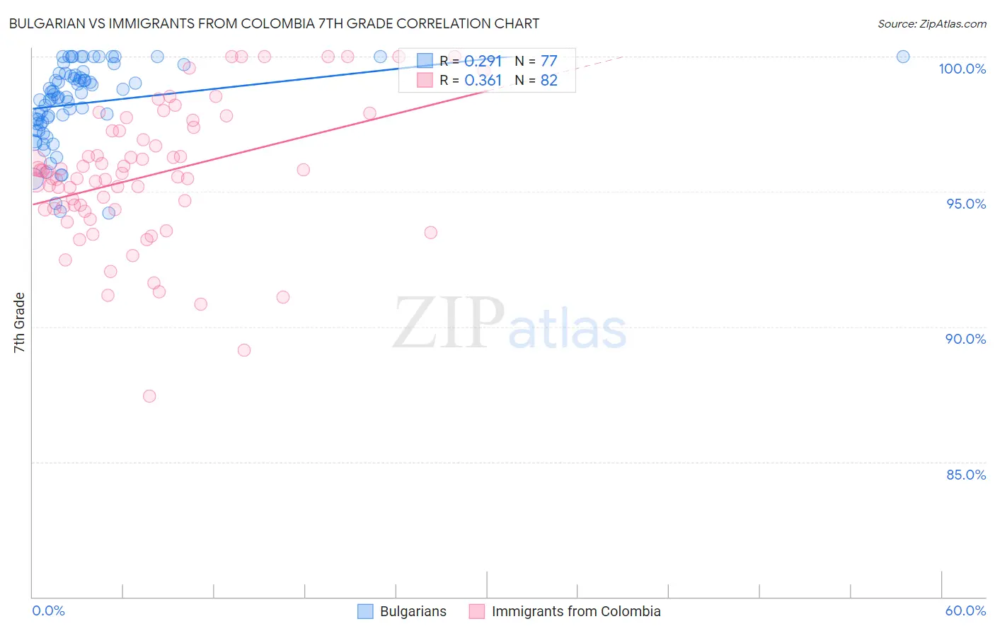 Bulgarian vs Immigrants from Colombia 7th Grade Correlation Chart