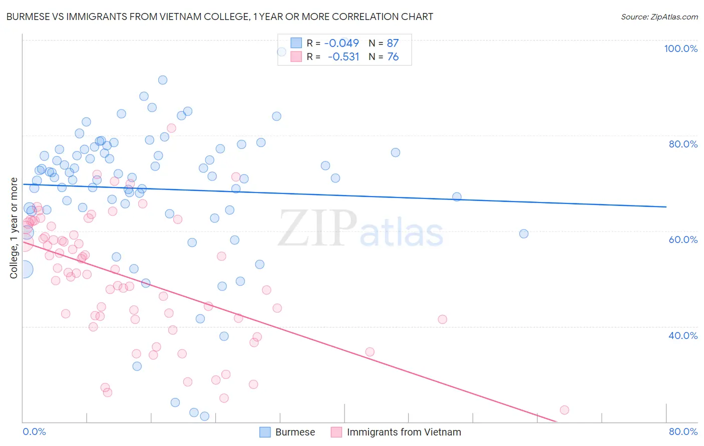 Burmese vs Immigrants from Vietnam College, 1 year or more Correlation Chart