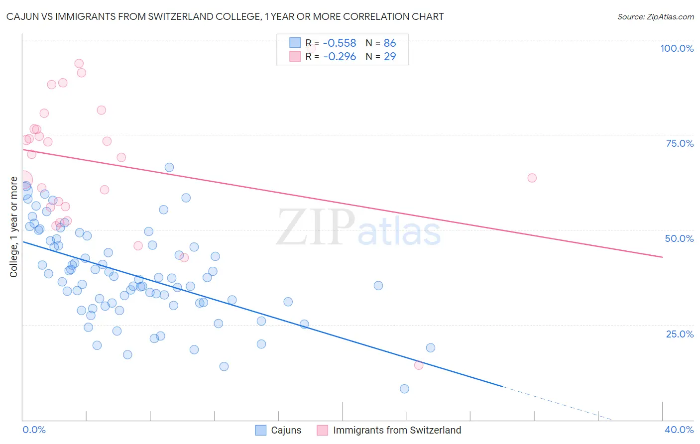Cajun vs Immigrants from Switzerland College, 1 year or more Correlation Chart