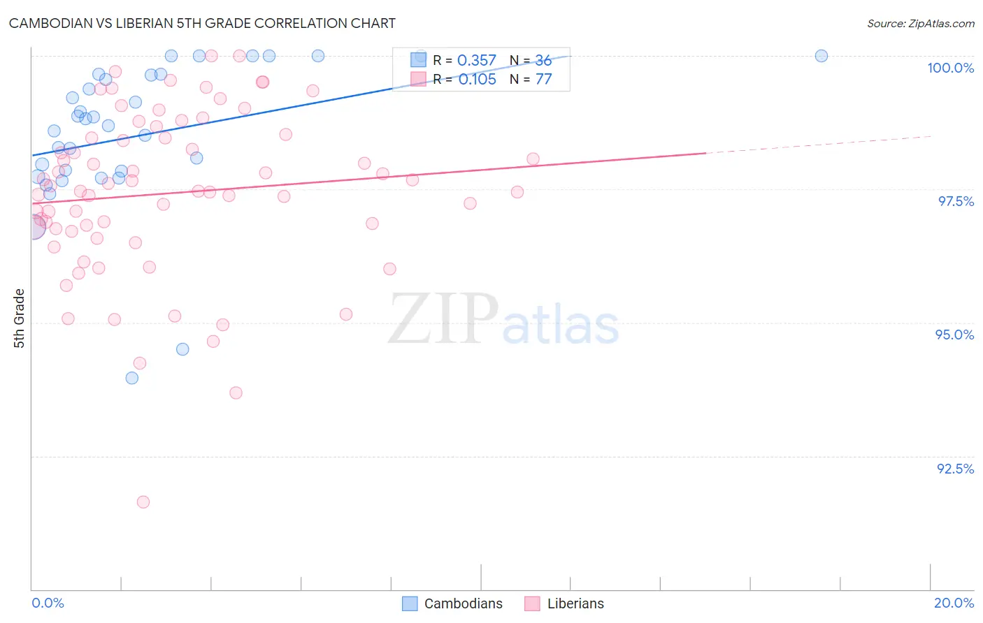 The statistical analysis conducted on geographies consisting of 102,511,743 people shows a mild positive correlation between the proportion of Cambodians and percentage of population with at least 5th grade education in the United States with a correlation coefficient (R) of 0.357 and weighted average of 97.6%. Similarly, the statistical analysis conducted on geographies consisting of 118,085,461 people shows a poor positive correlation between the proportion of Liberians and percentage of population with at least 5th grade education in the United States with a correlation coefficient (R) of 0.105 and weighted average of 97.0%, a difference of 0.52%.