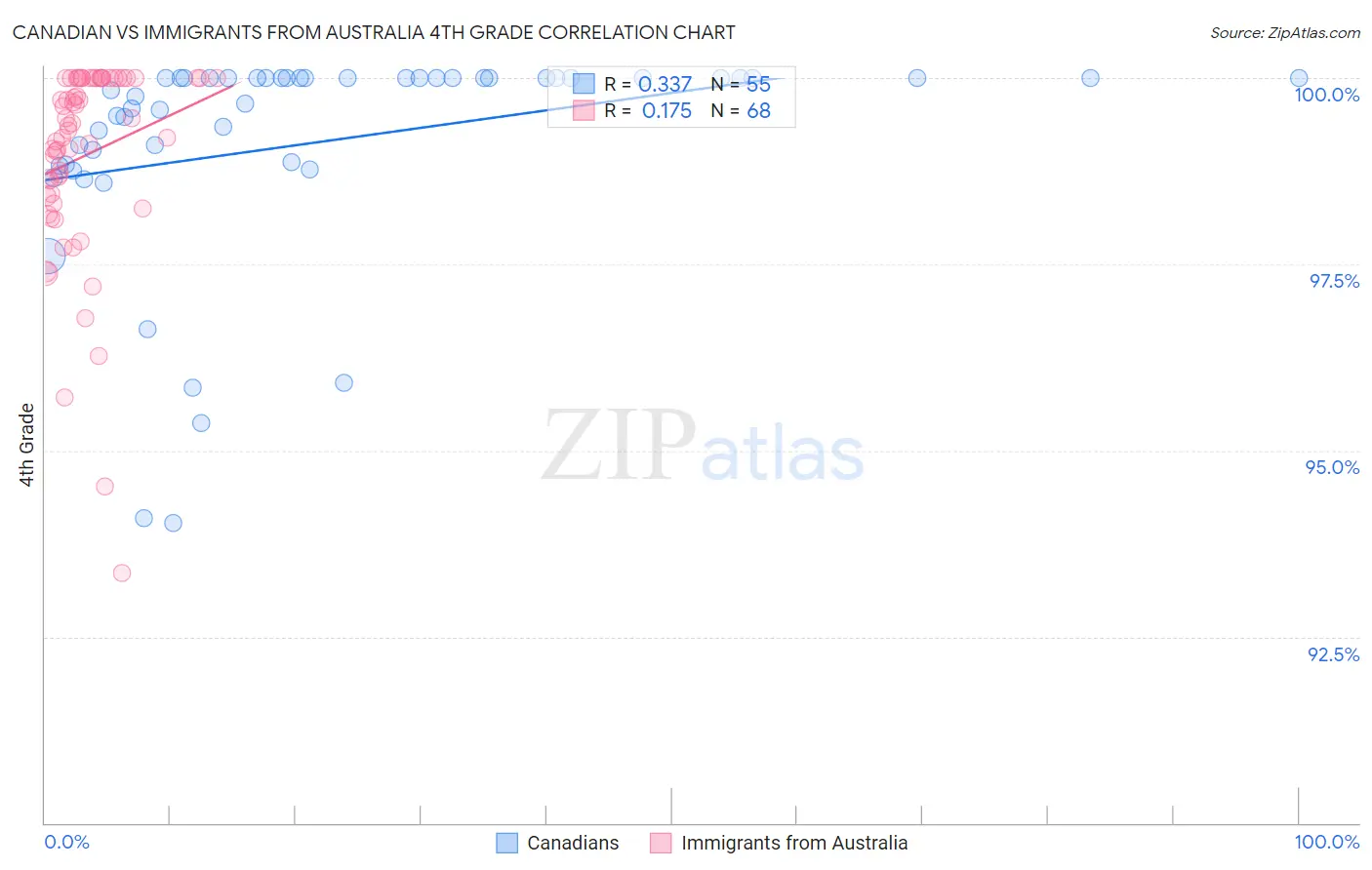 In terms of 4th grade, the demographic groups most similar to Canadians are New Zealander (98.0%, a difference of 0.0%), Kiowa (98.0%, a difference of 0.010%), Pueblo (98.0%, a difference of 0.010%), Immigrants from Austria (98.0%, a difference of 0.010%), and Lumbee (98.0%, a difference of 0.010%). Similarly, the demographic groups most similar to Immigrants from Australia are Cypriot (97.9%, a difference of 0.0%), Potawatomi (97.9%, a difference of 0.0%), Immigrants from Belgium (97.9%, a difference of 0.010%), Immigrants from India (98.0%, a difference of 0.030%), and Icelander (98.0%, a difference of 0.030%).
