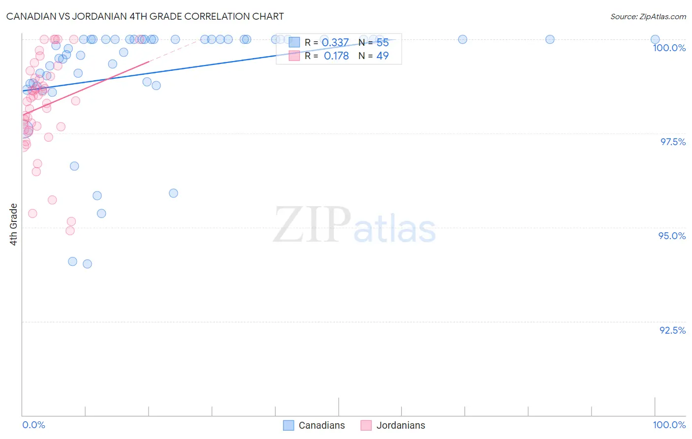 In terms of 4th grade, the demographic groups most similar to Canadians are Immigrants from Northern Europe (98.0%, a difference of 0.0%), New Zealander (98.0%, a difference of 0.0%), Russian (98.0%, a difference of 0.010%), Cajun (98.0%, a difference of 0.010%), and Kiowa (98.0%, a difference of 0.010%).