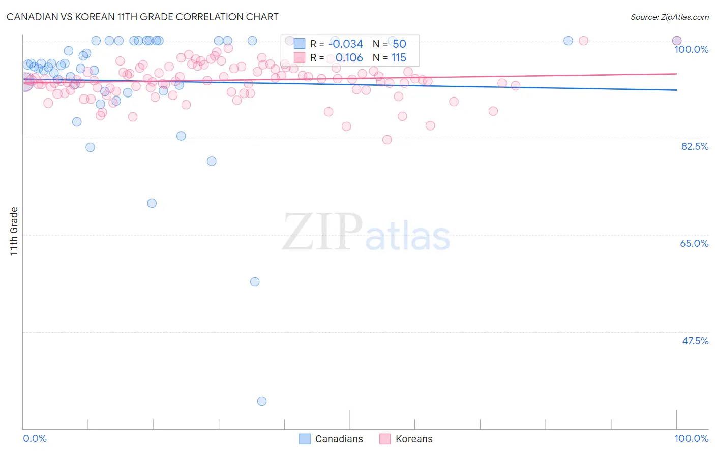 The statistical analysis conducted on geographies consisting of 437,556,598 people shows no correlation between the proportion of Canadians and percentage of population with at least 11th grade education in the United States with a correlation coefficient (R) of -0.034 and weighted average of 93.7%. Similarly, the statistical analysis conducted on geographies consisting of 510,943,943 people shows a poor positive correlation between the proportion of Koreans and percentage of population with at least 11th grade education in the United States with a correlation coefficient (R) of 0.106 and weighted average of 92.1%, a difference of 1.7%.