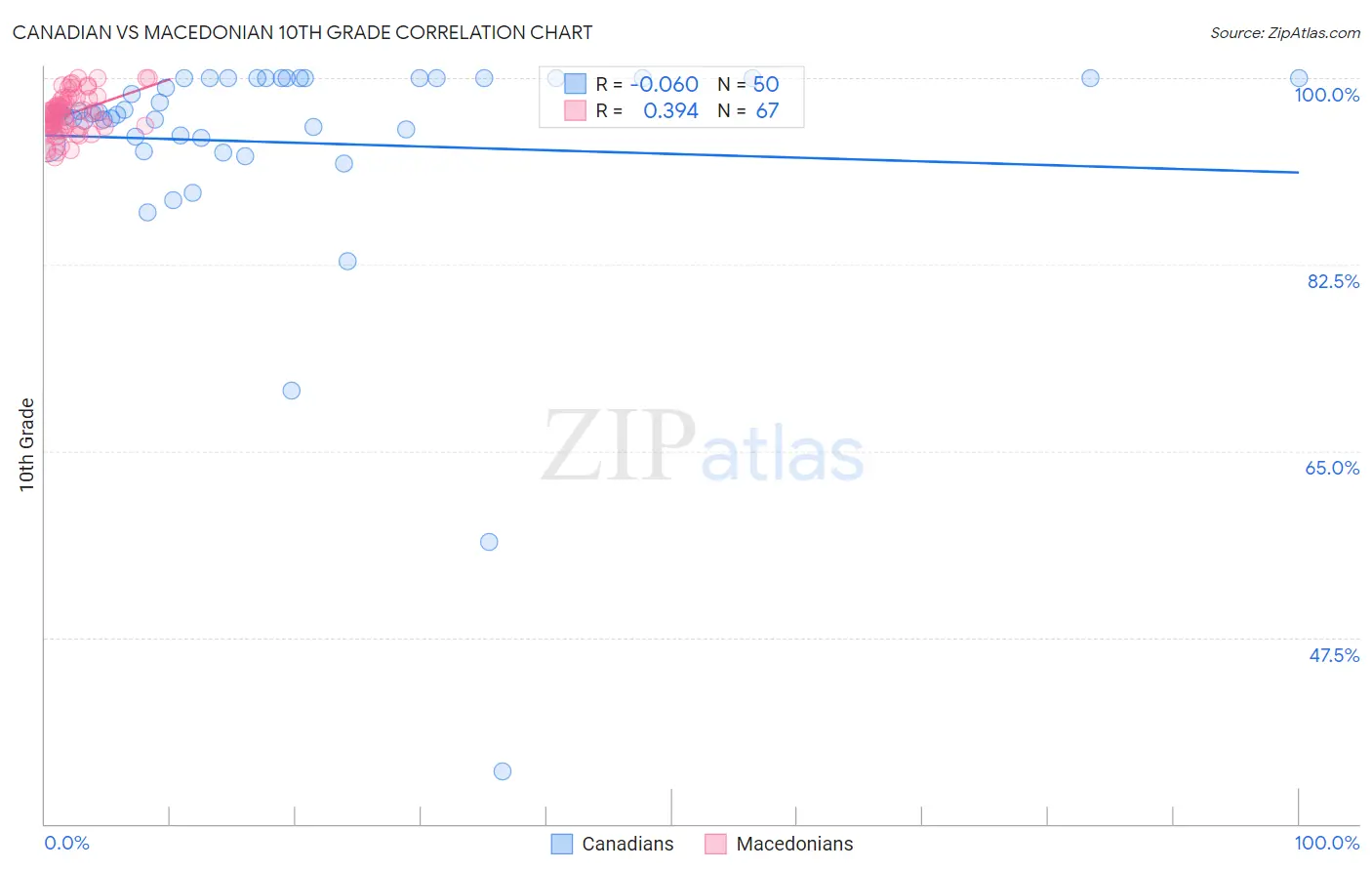 In terms of 10th grade, the demographic groups most similar to Canadians are Bhutanese (94.9%, a difference of 0.0%), Immigrants from Sweden (94.9%, a difference of 0.010%), Alaska Native (94.9%, a difference of 0.020%), Zimbabwean (94.9%, a difference of 0.030%), and Okinawan (94.8%, a difference of 0.030%).