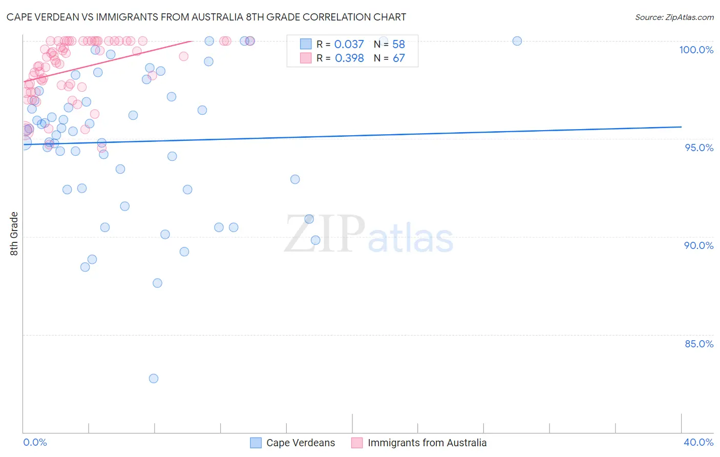 Cape Verdean vs Immigrants from Australia 8th Grade Correlation Chart