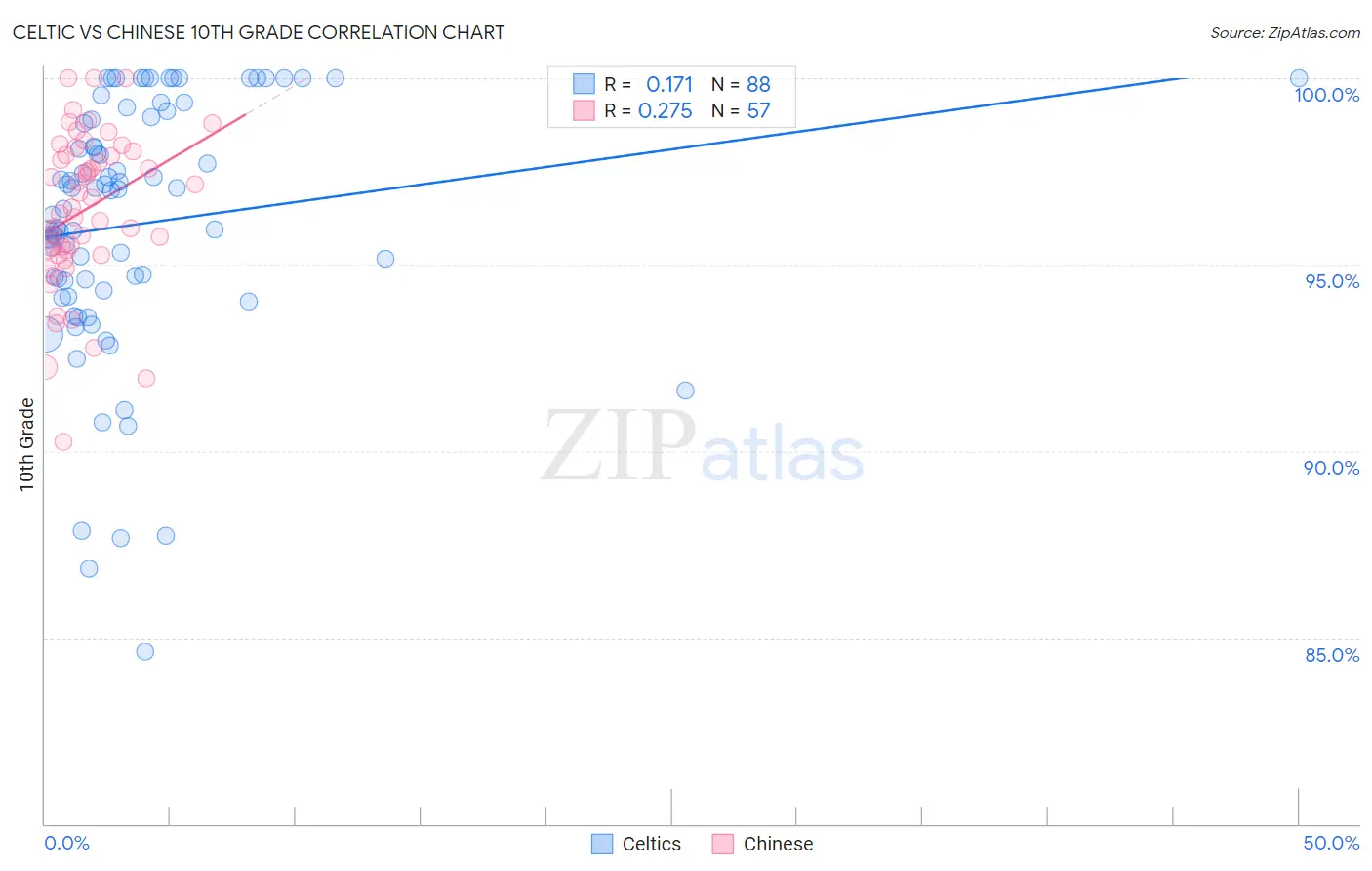 The statistical analysis conducted on geographies consisting of 168,876,981 people shows a poor positive correlation between the proportion of Celtics and percentage of population with at least 10th grade education in the United States with a correlation coefficient (R) of 0.171 and weighted average of 95.0%. Similarly, the statistical analysis conducted on geographies consisting of 64,808,150 people shows a weak positive correlation between the proportion of Chinese and percentage of population with at least 10th grade education in the United States with a correlation coefficient (R) of 0.275 and weighted average of 95.5%, a difference of 0.56%.