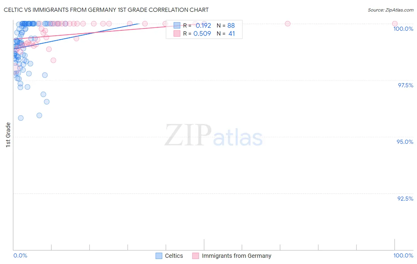 Celtic vs Immigrants from Germany 1st Grade Correlation Chart