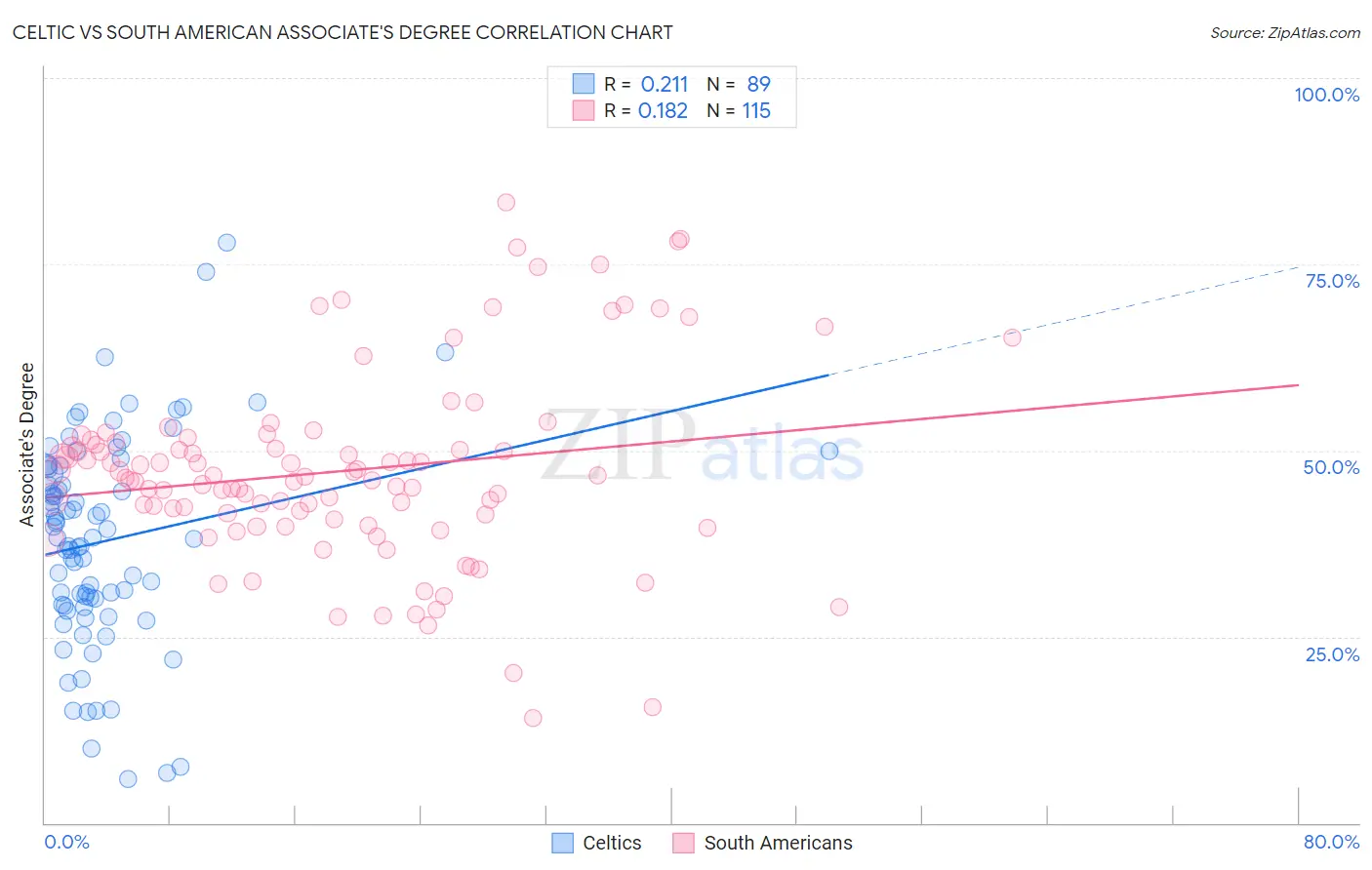 The statistical analysis conducted on geographies consisting of 168,877,276 people shows a weak positive correlation between the proportion of Celtics and percentage of population with at least associate's degree education in the United States with a correlation coefficient (R) of 0.211 and weighted average of 45.8%. Similarly, the statistical analysis conducted on geographies consisting of 494,120,152 people shows a poor positive correlation between the proportion of South Americans and percentage of population with at least associate's degree education in the United States with a correlation coefficient (R) of 0.182 and weighted average of 47.1%, a difference of 3.0%.
