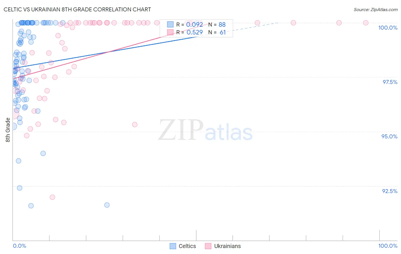 In terms of 8th grade, the demographic groups most similar to Celtics are Immigrants from Scotland (96.8%, a difference of 0.010%), Estonian (96.8%, a difference of 0.020%), Slavic (96.8%, a difference of 0.030%), Greek (96.8%, a difference of 0.030%), and Austrian (96.7%, a difference of 0.050%). Similarly, the demographic groups most similar to Ukrainians are Immigrants from India (96.6%, a difference of 0.0%), Native Hawaiian (96.6%, a difference of 0.0%), Canadian (96.6%, a difference of 0.010%), Iranian (96.6%, a difference of 0.010%), and White/Caucasian (96.7%, a difference of 0.020%).