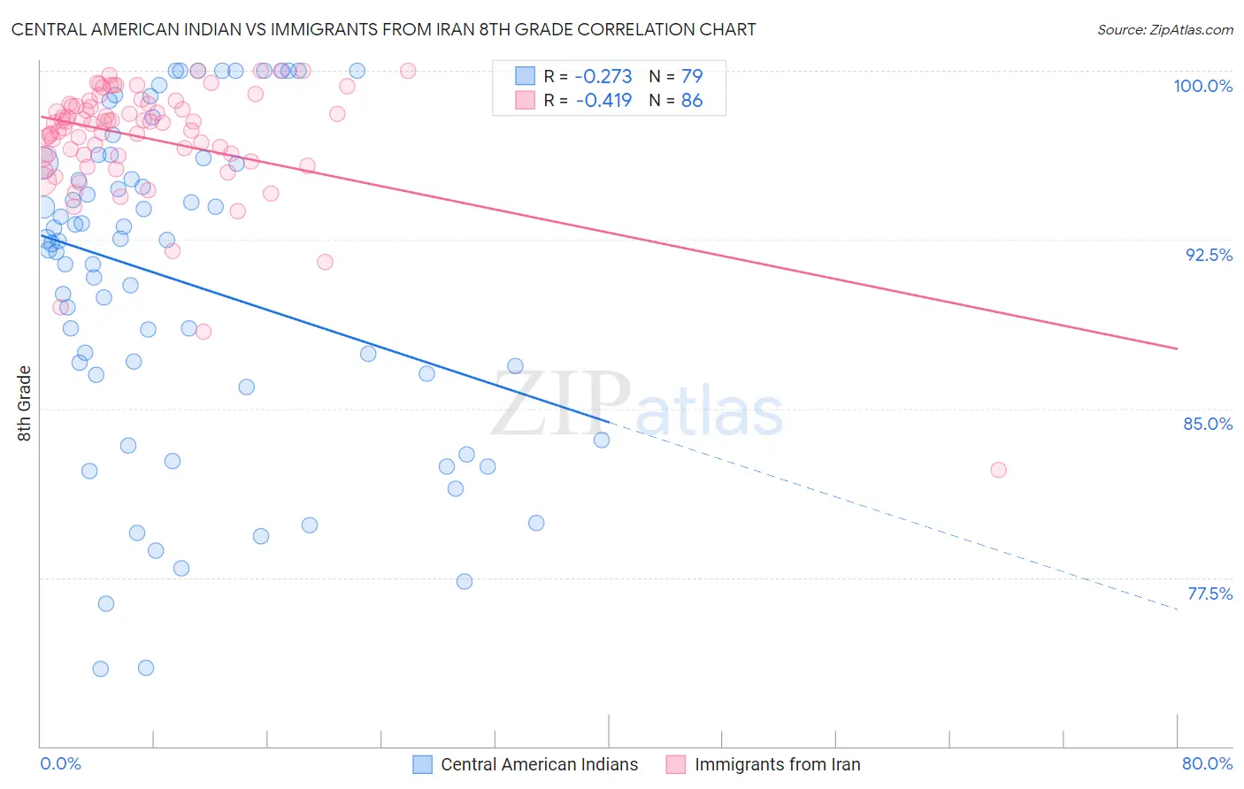 Central American Indian vs Immigrants from Iran 8th Grade Correlation Chart