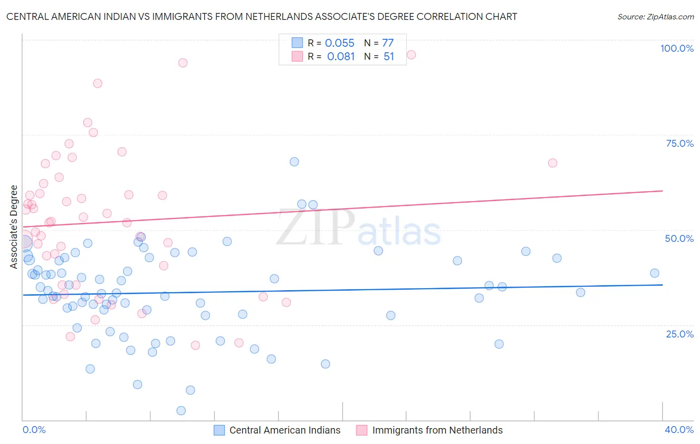 Central American Indian vs Immigrants from Netherlands Associate's Degree Correlation Chart