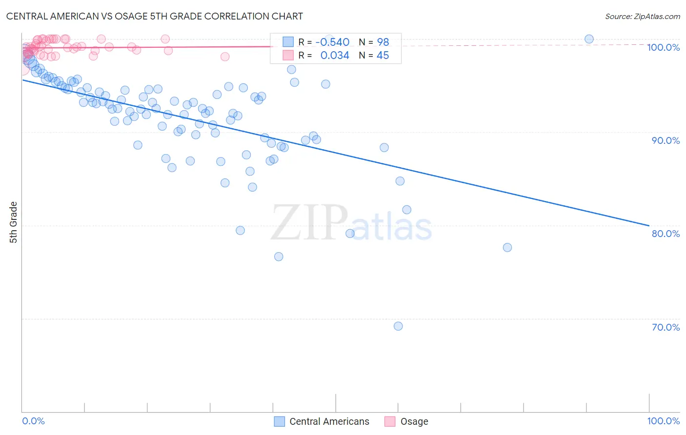 The statistical analysis conducted on geographies consisting of 504,619,198 people shows a substantial negative correlation between the proportion of Central Americans and percentage of population with at least 5th grade education in the United States with a correlation coefficient (R) of -0.540 and weighted average of 95.1%. Similarly, the statistical analysis conducted on geographies consisting of 91,808,929 people shows no correlation between the proportion of Osage and percentage of population with at least 5th grade education in the United States with a correlation coefficient (R) of 0.034 and weighted average of 97.8%, a difference of 2.9%.