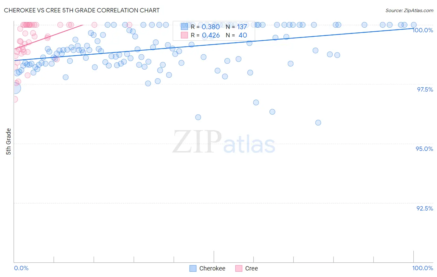 In terms of 5th grade, the demographic groups most similar to Cherokee are Lumbee (97.8%, a difference of 0.0%), Macedonian (97.9%, a difference of 0.010%), Ukrainian (97.8%, a difference of 0.010%), Immigrants from Netherlands (97.8%, a difference of 0.010%), and Immigrants from England (97.8%, a difference of 0.010%).