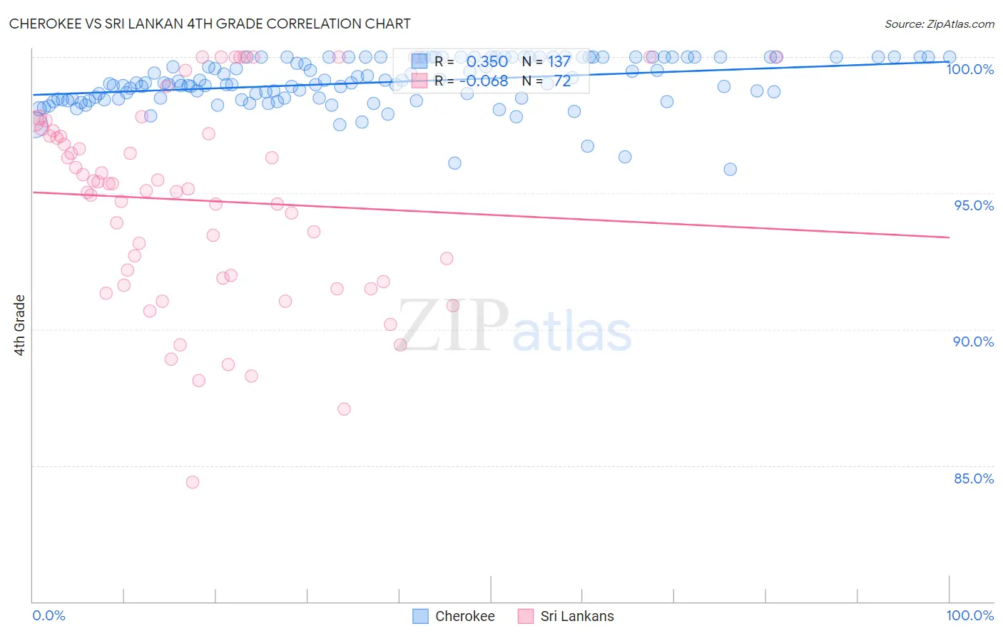 In terms of 4th grade, the demographic groups most similar to Cherokee are Immigrants from Netherlands (98.0%, a difference of 0.0%), Immigrants from Lithuania (98.0%, a difference of 0.0%), Immigrants from England (98.0%, a difference of 0.0%), Chickasaw (98.0%, a difference of 0.010%), and Ukrainian (98.0%, a difference of 0.010%).