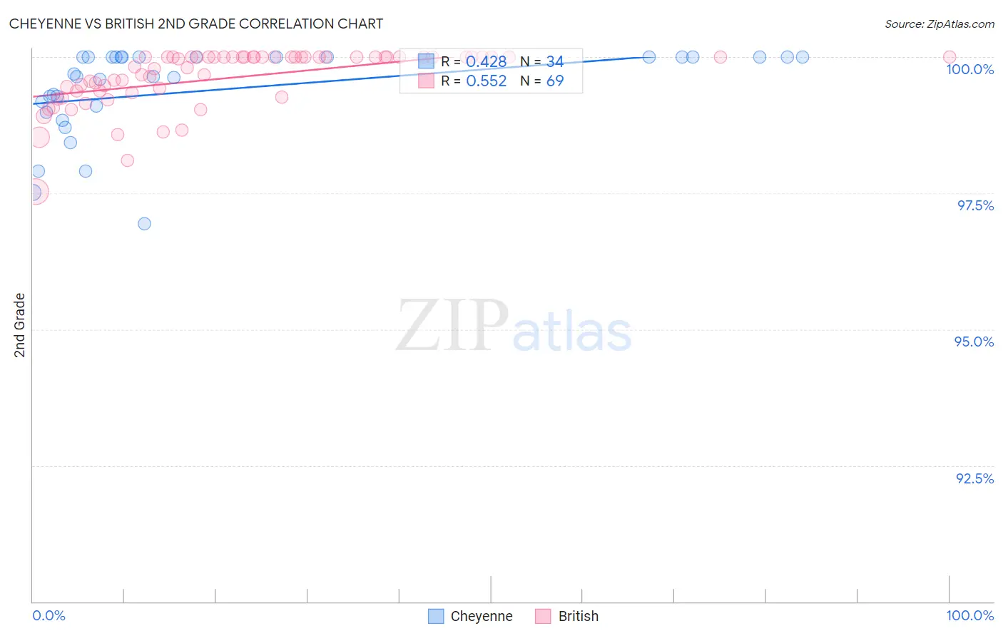 In terms of 2nd grade, the demographic groups most similar to Cheyenne are Cajun (98.3%, a difference of 0.0%), Chickasaw (98.3%, a difference of 0.010%), Canadian (98.3%, a difference of 0.020%), Immigrants from Northern Europe (98.3%, a difference of 0.020%), and Russian (98.3%, a difference of 0.020%).