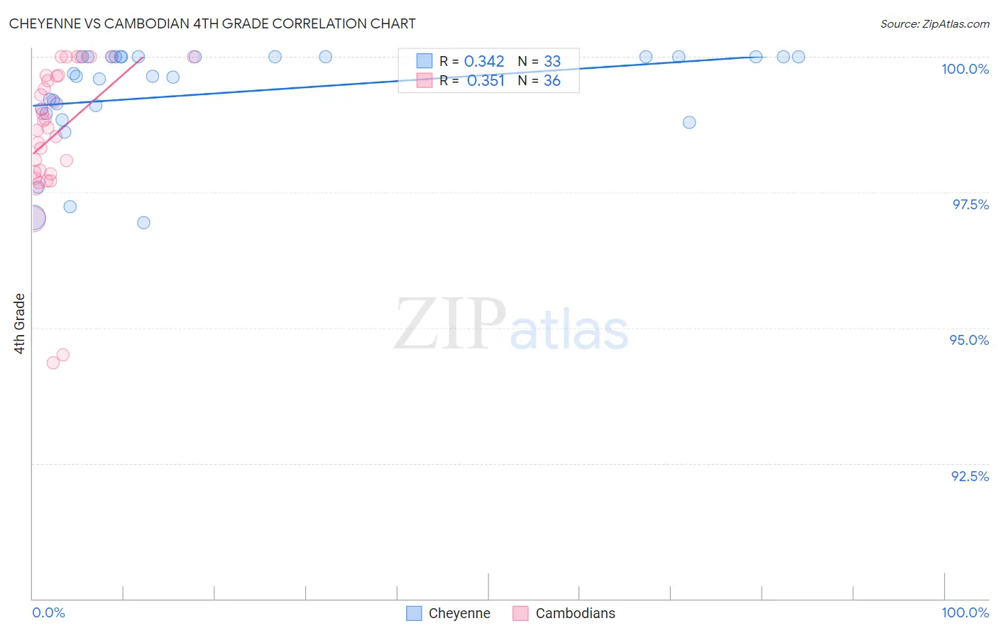 The statistical analysis conducted on geographies consisting of 80,716,760 people shows a mild positive correlation between the proportion of Cheyenne and percentage of population with at least 4th grade education in the United States with a correlation coefficient (R) of 0.342 and weighted average of 97.9%. Similarly, the statistical analysis conducted on geographies consisting of 102,511,743 people shows a mild positive correlation between the proportion of Cambodians and percentage of population with at least 4th grade education in the United States with a correlation coefficient (R) of 0.351 and weighted average of 97.7%, a difference of 0.20%.