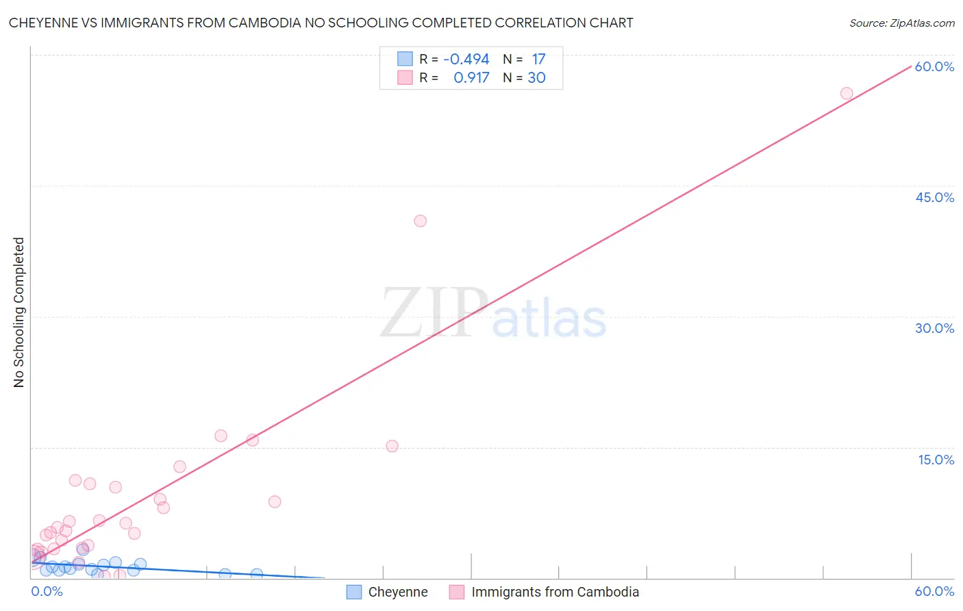 Cheyenne vs Immigrants from Cambodia No Schooling Completed Correlation Chart