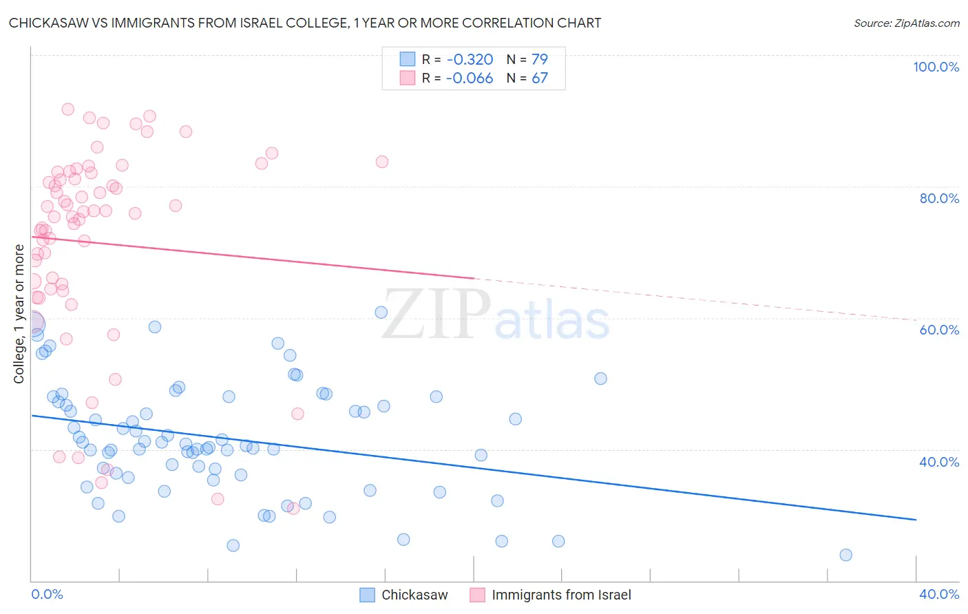 Chickasaw vs Immigrants from Israel College, 1 year or more Correlation Chart
