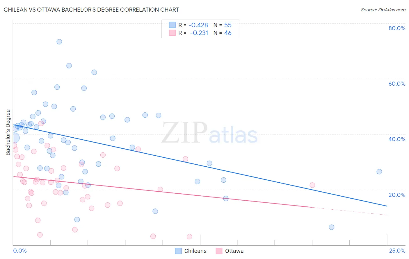 The statistical analysis conducted on geographies consisting of 256,683,612 people shows a moderate negative correlation between the proportion of Chileans and percentage of population with at least bachelor's degree education in the United States with a correlation coefficient (R) of -0.428 and weighted average of 41.2%. Similarly, the statistical analysis conducted on geographies consisting of 49,955,025 people shows a weak negative correlation between the proportion of Ottawa and percentage of population with at least bachelor's degree education in the United States with a correlation coefficient (R) of -0.231 and weighted average of 31.1%, a difference of 32.4%.