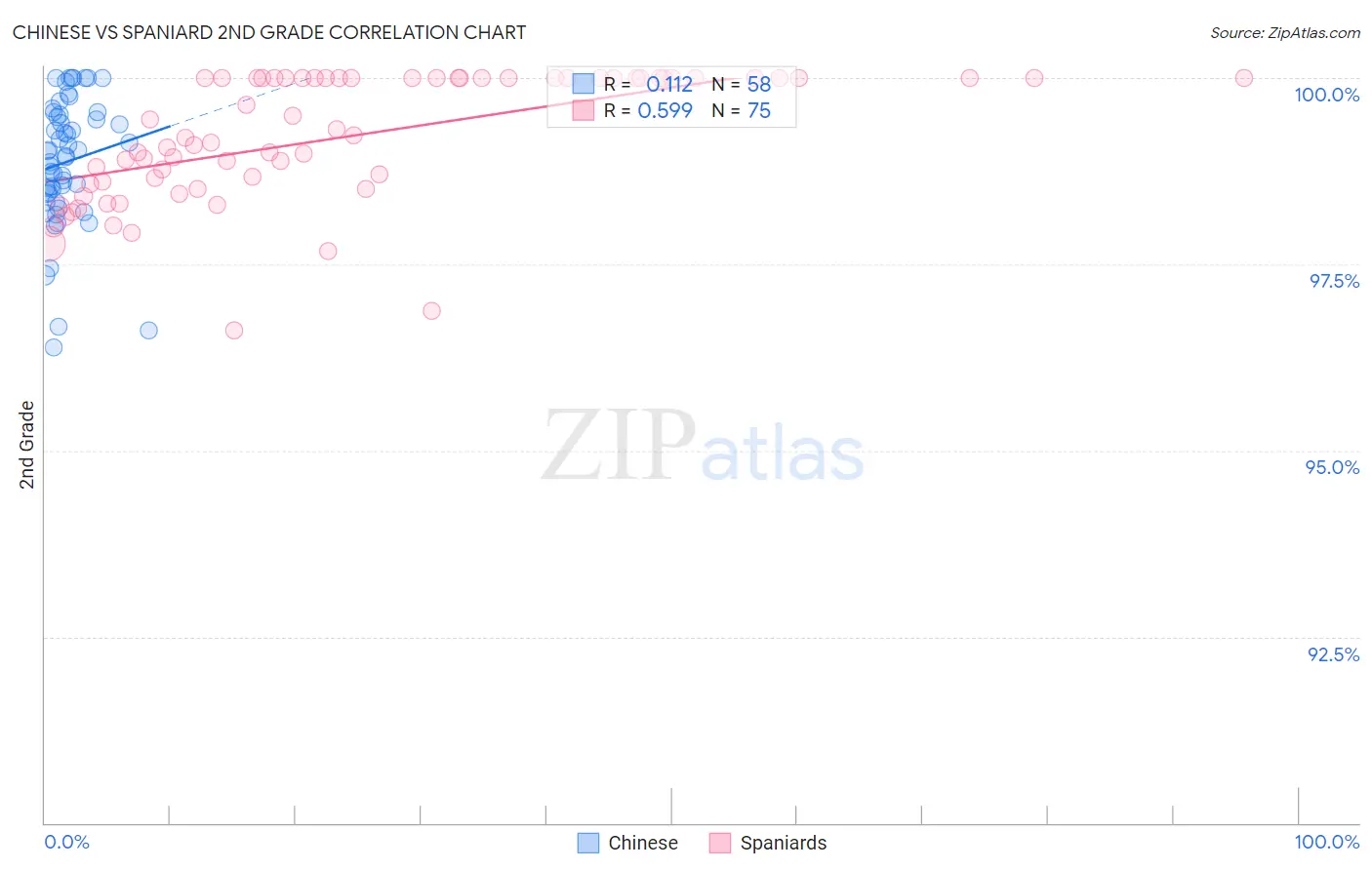 In terms of 2nd grade, the demographic groups most similar to Chinese are Swiss (98.5%, a difference of 0.010%), French Canadian (98.5%, a difference of 0.020%), Scandinavian (98.5%, a difference of 0.020%), British (98.5%, a difference of 0.020%), and European (98.5%, a difference of 0.030%).