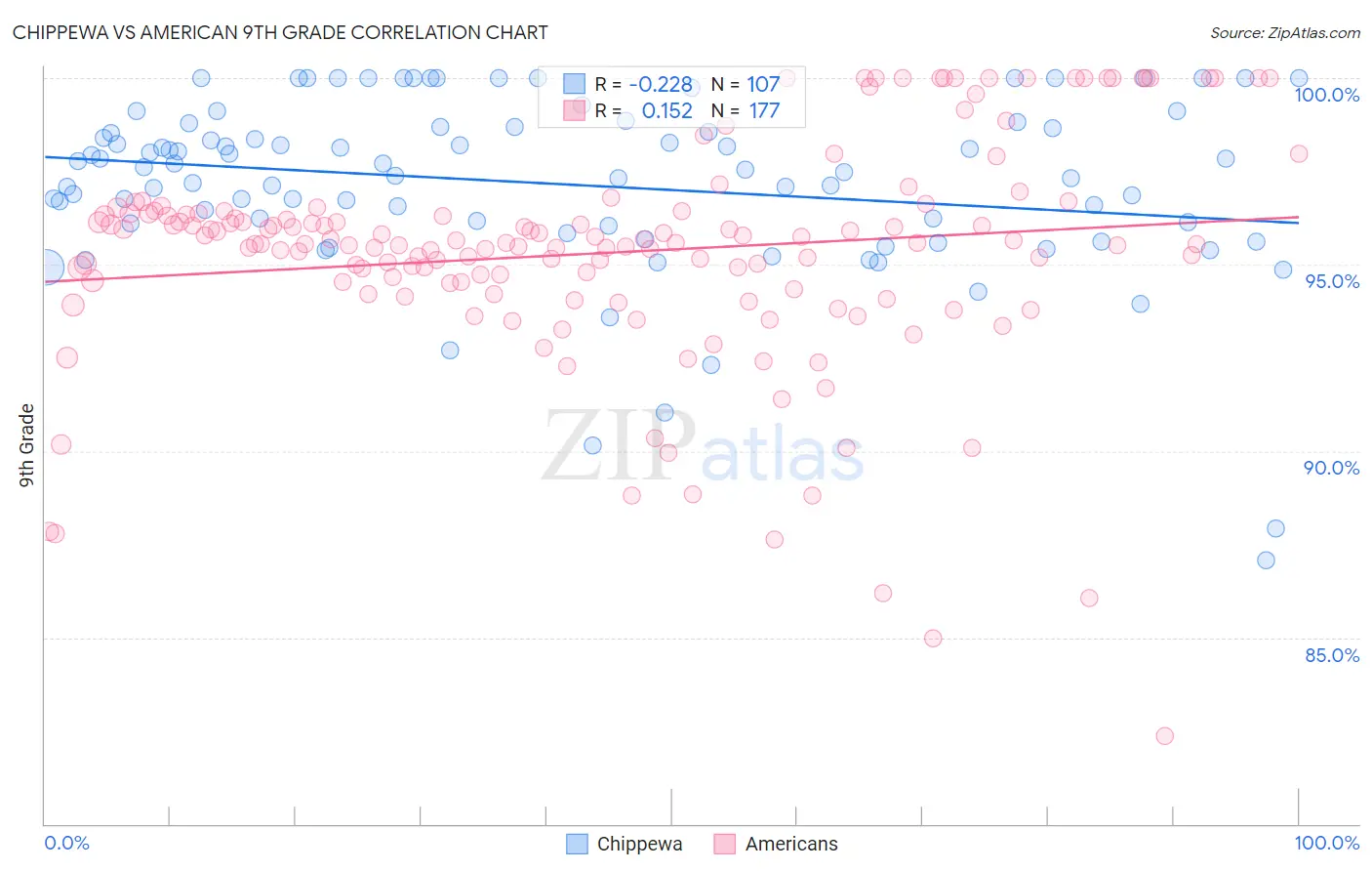 The statistical analysis conducted on geographies consisting of 215,065,864 people shows a weak negative correlation between the proportion of Chippewa and percentage of population with at least 9th grade education in the United States with a correlation coefficient (R) of -0.228 and weighted average of 96.1%. Similarly, the statistical analysis conducted on geographies consisting of 581,993,497 people shows a poor positive correlation between the proportion of Americans and percentage of population with at least 9th grade education in the United States with a correlation coefficient (R) of 0.152 and weighted average of 95.6%, a difference of 0.51%.