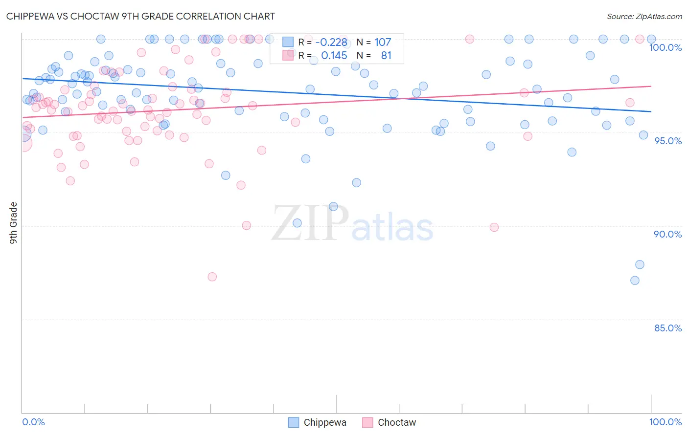 The statistical analysis conducted on geographies consisting of 215,065,864 people shows a weak negative correlation between the proportion of Chippewa and percentage of population with at least 9th grade education in the United States with a correlation coefficient (R) of -0.228 and weighted average of 96.1%. Similarly, the statistical analysis conducted on geographies consisting of 269,742,875 people shows a poor positive correlation between the proportion of Choctaw and percentage of population with at least 9th grade education in the United States with a correlation coefficient (R) of 0.145 and weighted average of 95.1%, a difference of 1.0%.