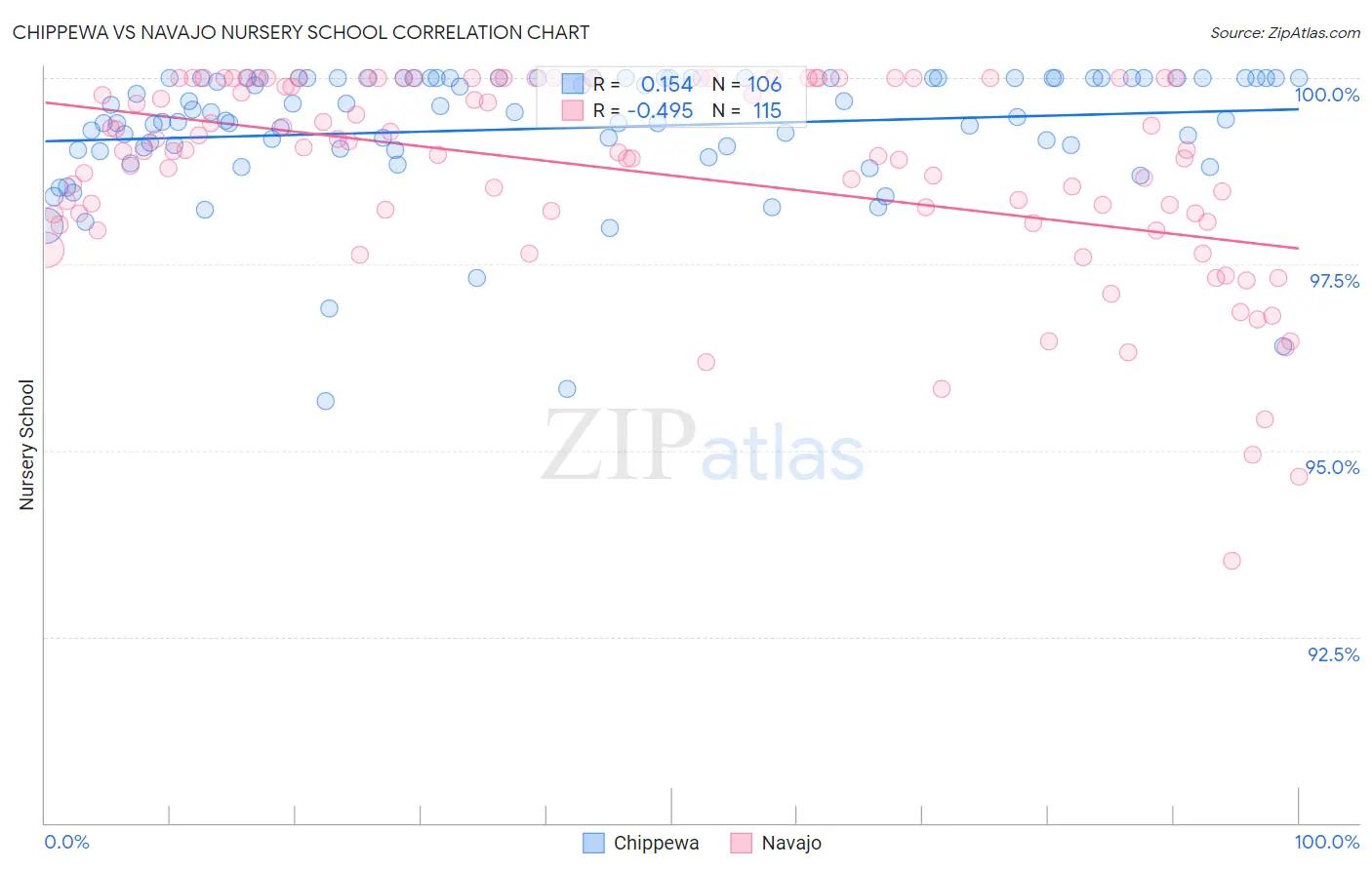 In terms of nursery school, the demographic groups most similar to Chippewa are Latvian (98.5%, a difference of 0.0%), Lumbee (98.5%, a difference of 0.010%), Italian (98.5%, a difference of 0.010%), Luxembourger (98.5%, a difference of 0.010%), and Eastern European (98.5%, a difference of 0.010%).
