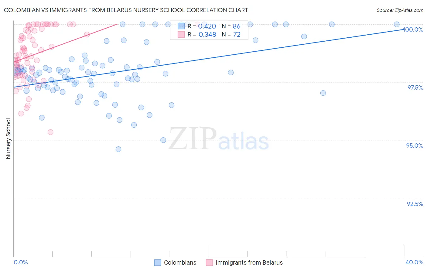 Colombian vs Immigrants from Belarus Nursery School Correlation Chart