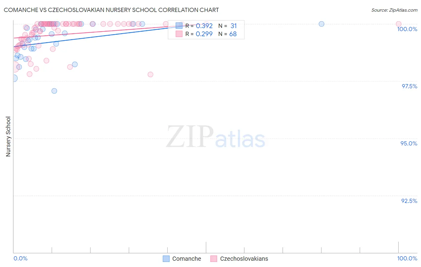 In terms of nursery school, the demographic groups most similar to Comanche are Immigrants from South Central Asia (98.0%, a difference of 0.0%), Venezuelan (98.0%, a difference of 0.0%), Immigrants from North Macedonia (98.0%, a difference of 0.0%), Dutch West Indian (98.0%, a difference of 0.010%), and Immigrants from Moldova (98.0%, a difference of 0.010%).