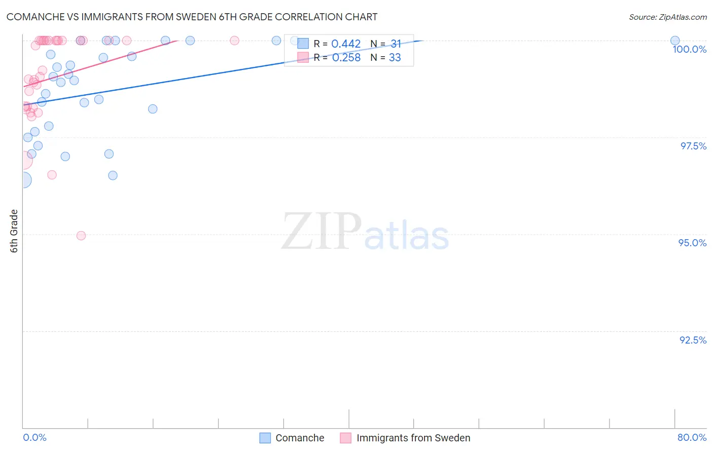Comanche vs Immigrants from Sweden 6th Grade Correlation Chart