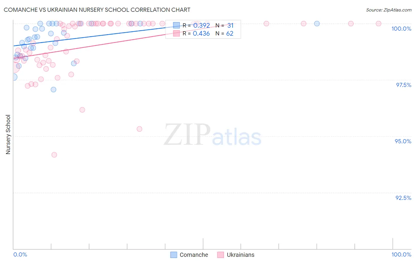 In terms of nursery school, the demographic groups most similar to Comanche are Immigrants from South Central Asia (98.0%, a difference of 0.0%), Venezuelan (98.0%, a difference of 0.0%), Immigrants from North Macedonia (98.0%, a difference of 0.0%), Dutch West Indian (98.0%, a difference of 0.010%), and Immigrants from Moldova (98.0%, a difference of 0.010%).