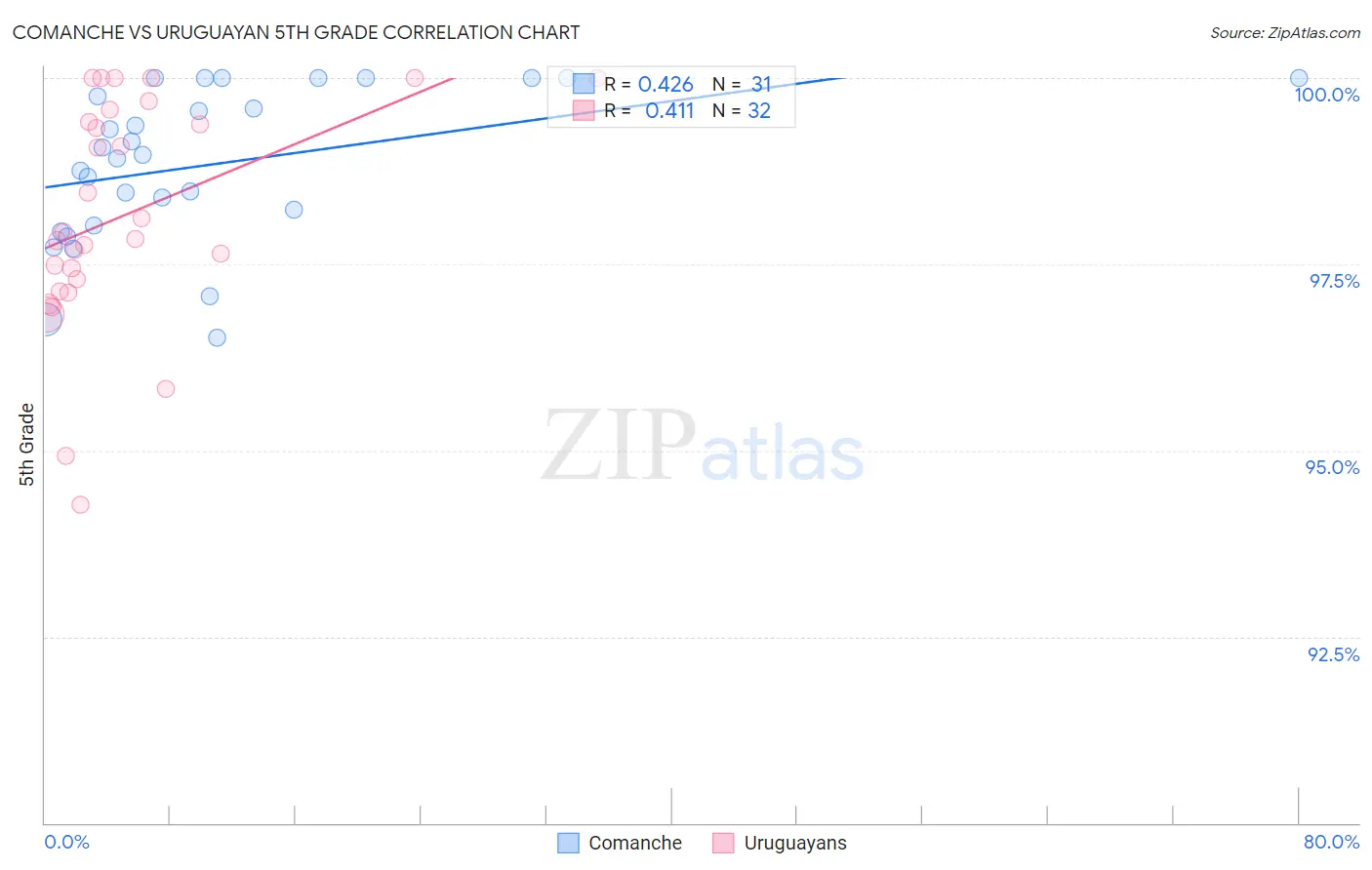 In terms of 5th grade, the demographic groups most similar to Comanche are Immigrants from Kenya (97.3%, a difference of 0.010%), Pakistani (97.3%, a difference of 0.010%), Argentinean (97.3%, a difference of 0.010%), Mongolian (97.3%, a difference of 0.010%), and Immigrants from Spain (97.3%, a difference of 0.020%).