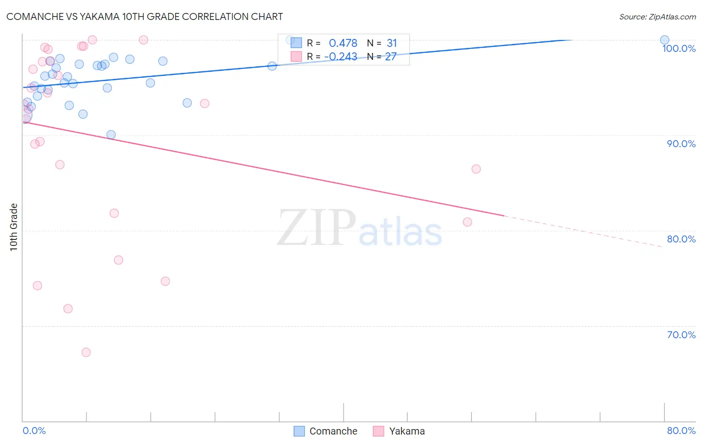 In terms of 10th grade, the demographic groups most similar to Comanche are South American Indian (93.1%, a difference of 0.0%), Bahamian (93.1%, a difference of 0.0%), Immigrants from Ethiopia (93.1%, a difference of 0.010%), Immigrants from Africa (93.1%, a difference of 0.010%), and Subsaharan African (93.1%, a difference of 0.010%).