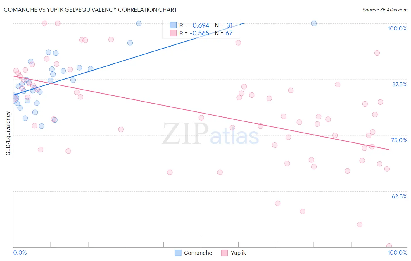 The statistical analysis conducted on geographies consisting of 109,786,530 people shows a significant positive correlation between the proportion of Comanche and percentage of population with at least ged/equivalency education in the United States with a correlation coefficient (R) of 0.694 and weighted average of 83.6%. Similarly, the statistical analysis conducted on geographies consisting of 39,962,947 people shows a substantial negative correlation between the proportion of Yup'ik and percentage of population with at least ged/equivalency education in the United States with a correlation coefficient (R) of -0.565 and weighted average of 80.0%, a difference of 4.4%.