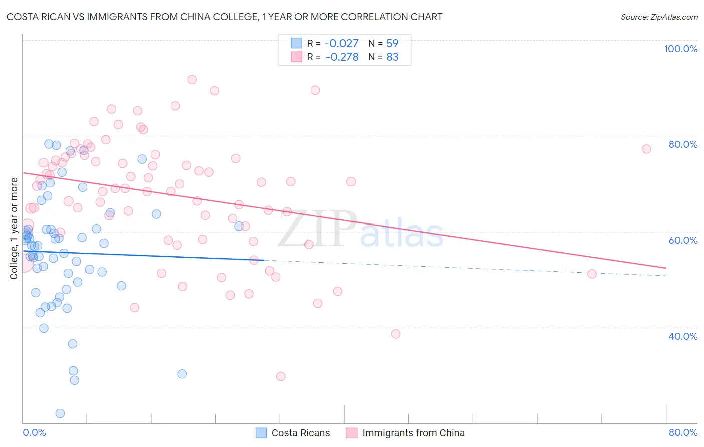 Costa Rican vs Immigrants from China College, 1 year or more Correlation Chart