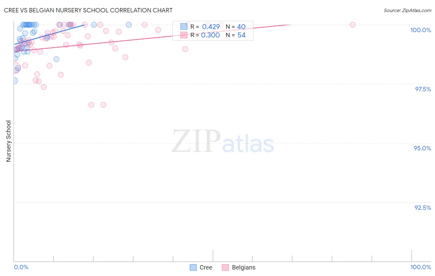In terms of nursery school, the demographic groups most similar to Cree are Immigrants from Ireland (98.3%, a difference of 0.0%), Puget Sound Salish (98.3%, a difference of 0.010%), Romanian (98.3%, a difference of 0.010%), Bhutanese (98.2%, a difference of 0.010%), and Turkish (98.2%, a difference of 0.010%).