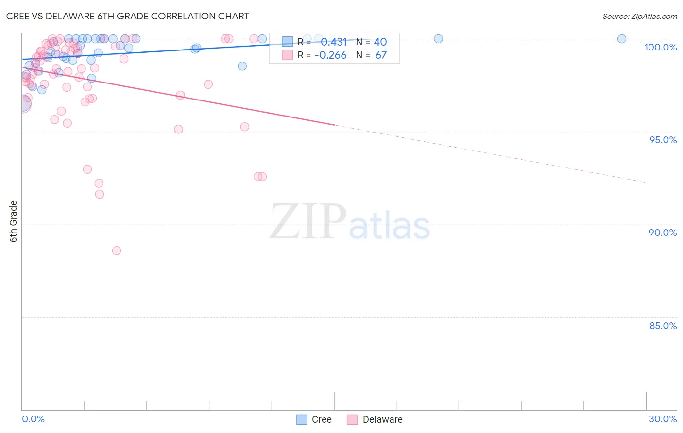 In terms of 6th grade, the demographic groups most similar to Cree are Romanian (97.5%, a difference of 0.0%), Cypriot (97.5%, a difference of 0.0%), Immigrants from Ireland (97.5%, a difference of 0.0%), Immigrants from Germany (97.5%, a difference of 0.0%), and Immigrants from Sweden (97.5%, a difference of 0.0%). Similarly, the demographic groups most similar to Delaware are Shoshone (97.6%, a difference of 0.010%), Immigrants from Belgium (97.5%, a difference of 0.010%), Puget Sound Salish (97.5%, a difference of 0.010%), Immigrants from South Africa (97.5%, a difference of 0.010%), and Immigrants from Australia (97.5%, a difference of 0.010%).