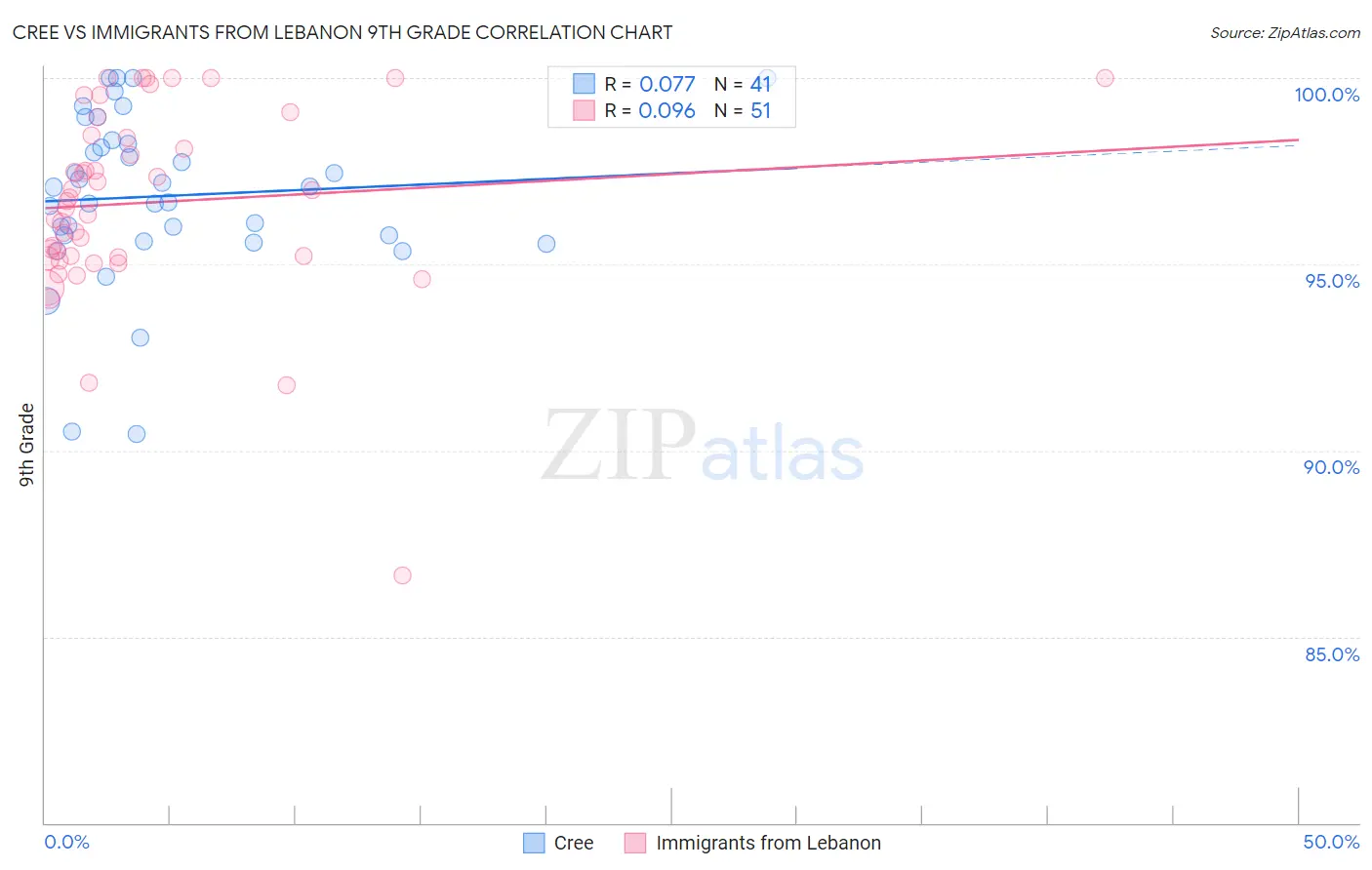 In terms of 9th grade, the demographic groups most similar to Cree are Immigrants from Romania (95.4%, a difference of 0.0%), Immigrants from Turkey (95.4%, a difference of 0.0%), Soviet Union (95.4%, a difference of 0.0%), Cambodian (95.4%, a difference of 0.0%), and Immigrants from Kuwait (95.4%, a difference of 0.0%).