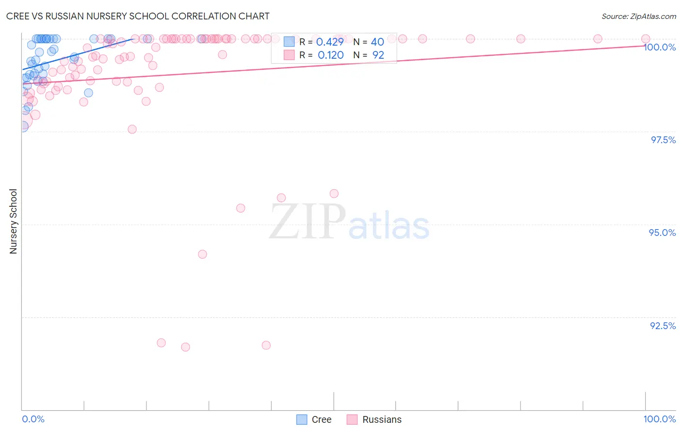 In terms of nursery school, the demographic groups most similar to Cree are Immigrants from Ireland (98.3%, a difference of 0.0%), Puget Sound Salish (98.3%, a difference of 0.010%), Romanian (98.3%, a difference of 0.010%), Bhutanese (98.2%, a difference of 0.010%), and Turkish (98.2%, a difference of 0.010%).
