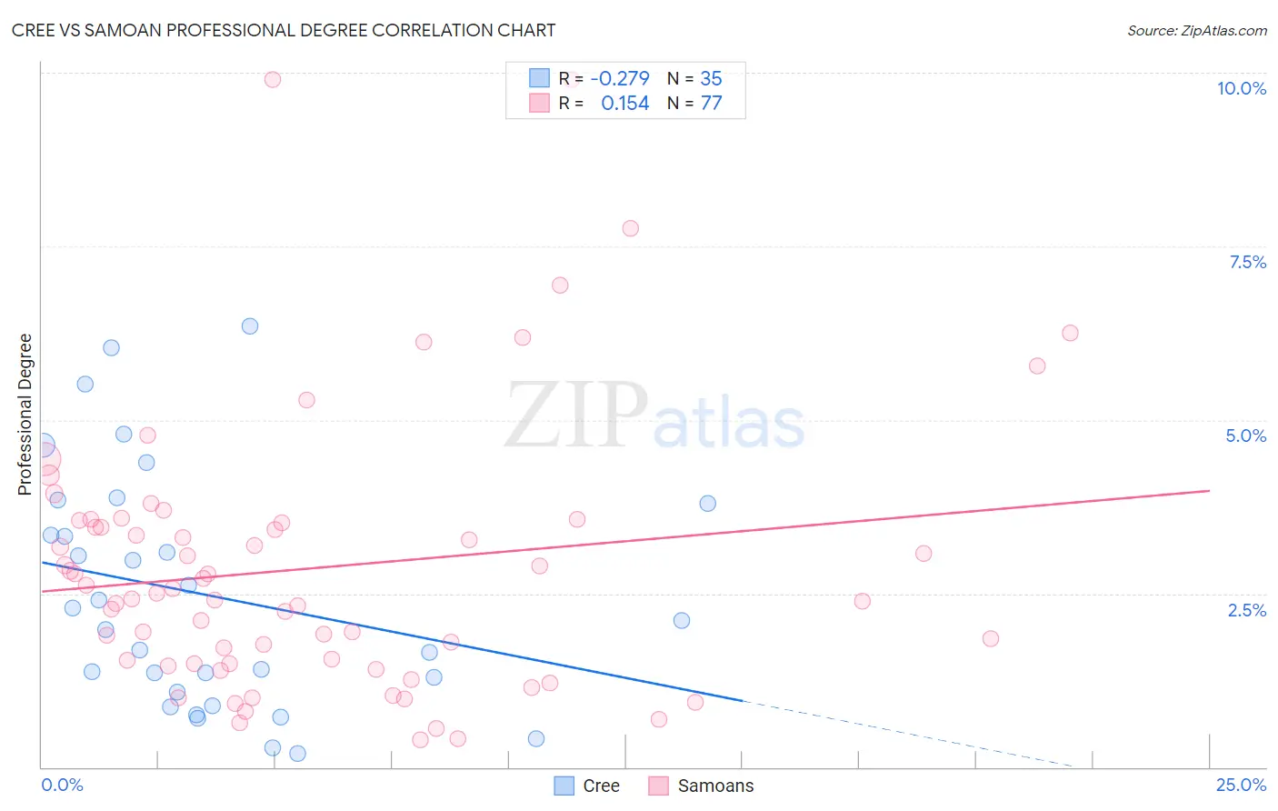 The statistical analysis conducted on geographies consisting of 76,148,984 people shows a weak negative correlation between the proportion of Cree and percentage of population with at least professional degree education in the United States with a correlation coefficient (R) of -0.279 and weighted average of 3.9%. Similarly, the statistical analysis conducted on geographies consisting of 224,756,232 people shows a poor positive correlation between the proportion of Samoans and percentage of population with at least professional degree education in the United States with a correlation coefficient (R) of 0.154 and weighted average of 3.3%, a difference of 17.6%.
