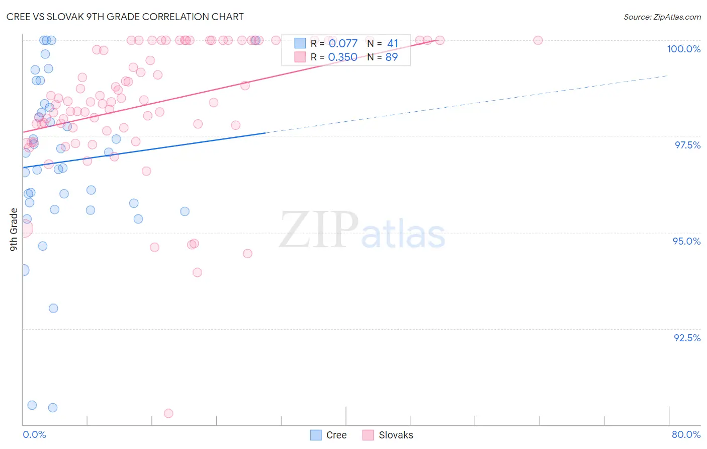 The statistical analysis conducted on geographies consisting of 76,211,744 people shows a slight positive correlation between the proportion of Cree and percentage of population with at least 9th grade education in the United States with a correlation coefficient (R) of 0.077 and weighted average of 95.4%. Similarly, the statistical analysis conducted on geographies consisting of 397,891,887 people shows a mild positive correlation between the proportion of Slovaks and percentage of population with at least 9th grade education in the United States with a correlation coefficient (R) of 0.350 and weighted average of 96.9%, a difference of 1.5%.