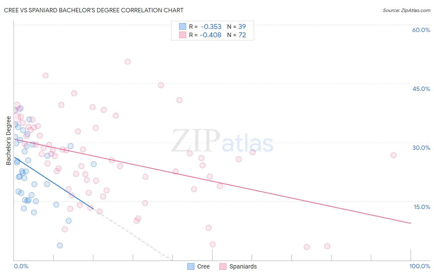 The statistical analysis conducted on geographies consisting of 76,210,625 people shows a mild negative correlation between the proportion of Cree and percentage of population with at least bachelor's degree education in the United States with a correlation coefficient (R) of -0.353 and weighted average of 33.6%. Similarly, the statistical analysis conducted on geographies consisting of 443,489,635 people shows a moderate negative correlation between the proportion of Spaniards and percentage of population with at least bachelor's degree education in the United States with a correlation coefficient (R) of -0.408 and weighted average of 36.6%, a difference of 9.0%.