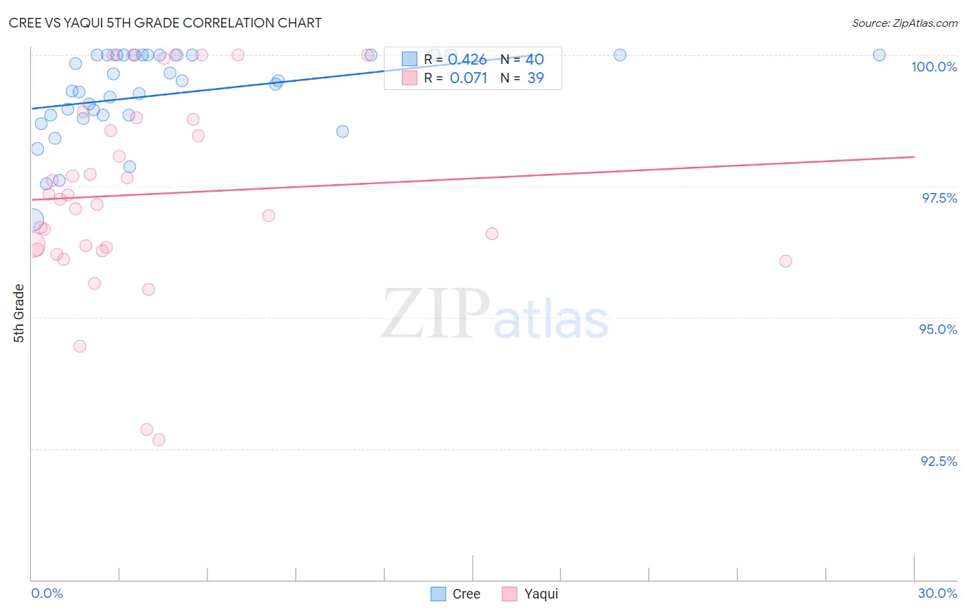 In terms of 5th grade, the demographic groups most similar to Cree are Immigrants from Denmark (97.8%, a difference of 0.010%), Romanian (97.8%, a difference of 0.010%), Immigrants from Germany (97.8%, a difference of 0.010%), Yugoslavian (97.7%, a difference of 0.010%), and Turkish (97.7%, a difference of 0.010%).