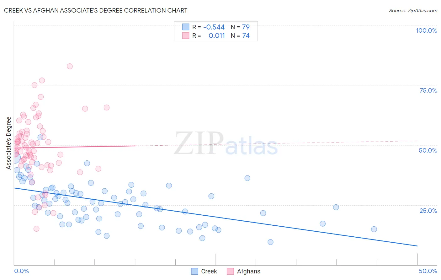The statistical analysis conducted on geographies consisting of 178,480,454 people shows a substantial negative correlation between the proportion of Creek and percentage of population with at least associate's degree education in the United States with a correlation coefficient (R) of -0.544 and weighted average of 37.6%. Similarly, the statistical analysis conducted on geographies consisting of 148,873,892 people shows no correlation between the proportion of Afghans and percentage of population with at least associate's degree education in the United States with a correlation coefficient (R) of 0.011 and weighted average of 48.9%, a difference of 30.1%.