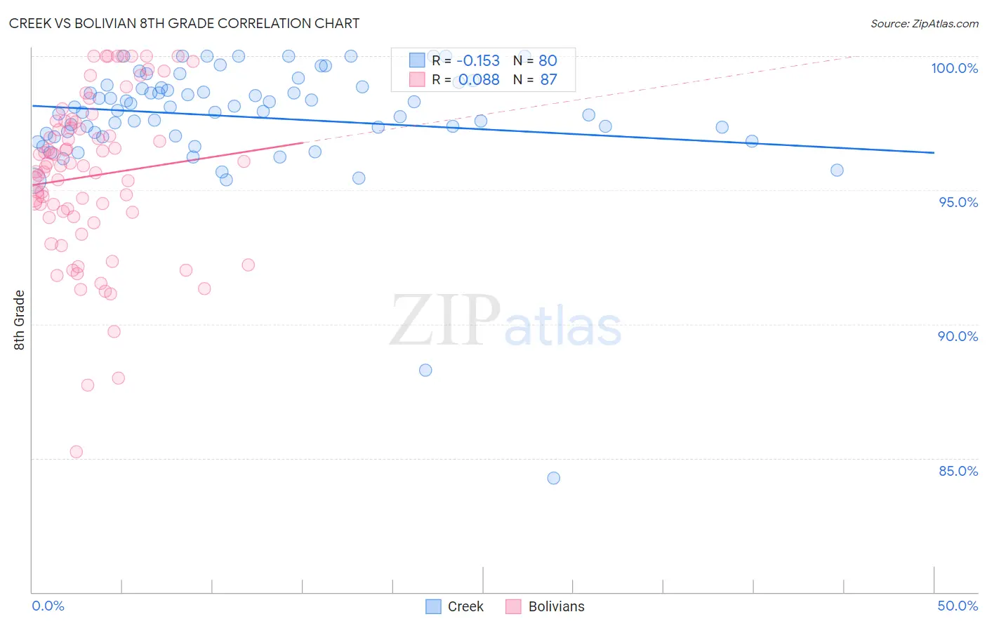 In terms of 8th grade, the demographic groups most similar to Creek are American (96.6%, a difference of 0.0%), Iranian (96.6%, a difference of 0.010%), Immigrants from India (96.6%, a difference of 0.020%), Native Hawaiian (96.6%, a difference of 0.020%), and Canadian (96.6%, a difference of 0.020%).