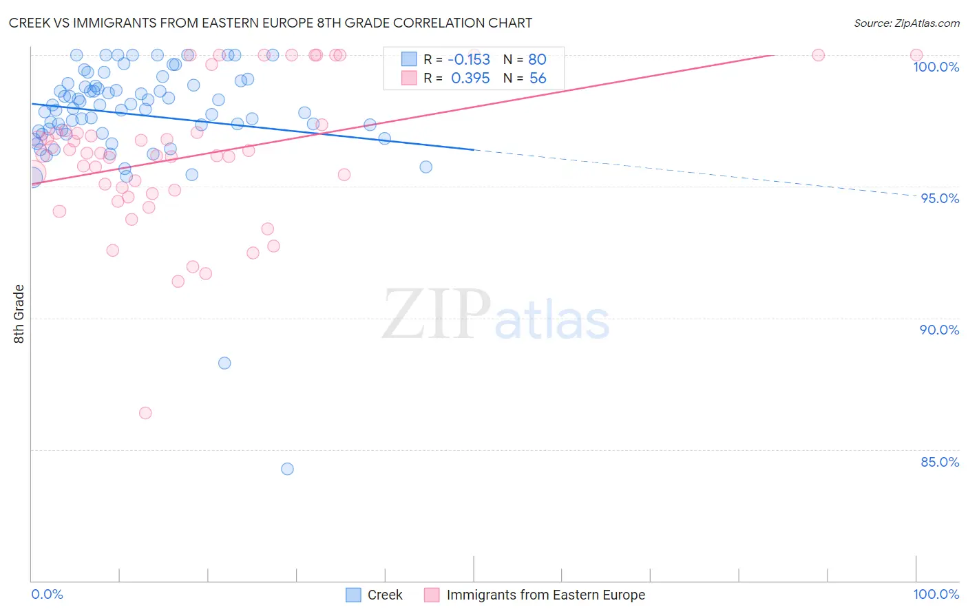 In terms of 8th grade, the demographic groups most similar to Creek are American (96.6%, a difference of 0.0%), Iranian (96.6%, a difference of 0.010%), Immigrants from India (96.6%, a difference of 0.020%), Native Hawaiian (96.6%, a difference of 0.020%), and Canadian (96.6%, a difference of 0.020%).