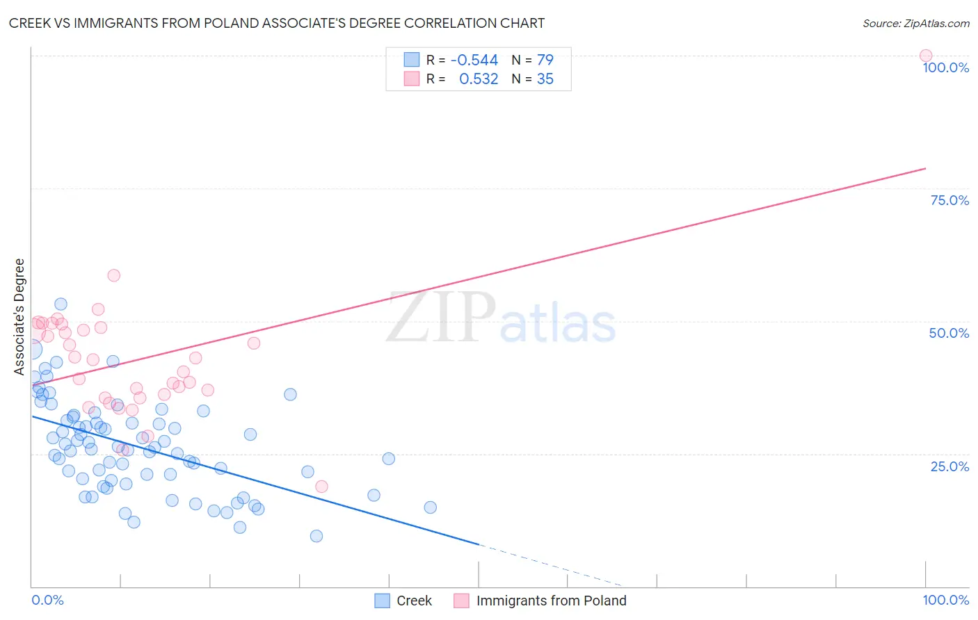Creek vs Immigrants from Poland Associate's Degree Correlation Chart