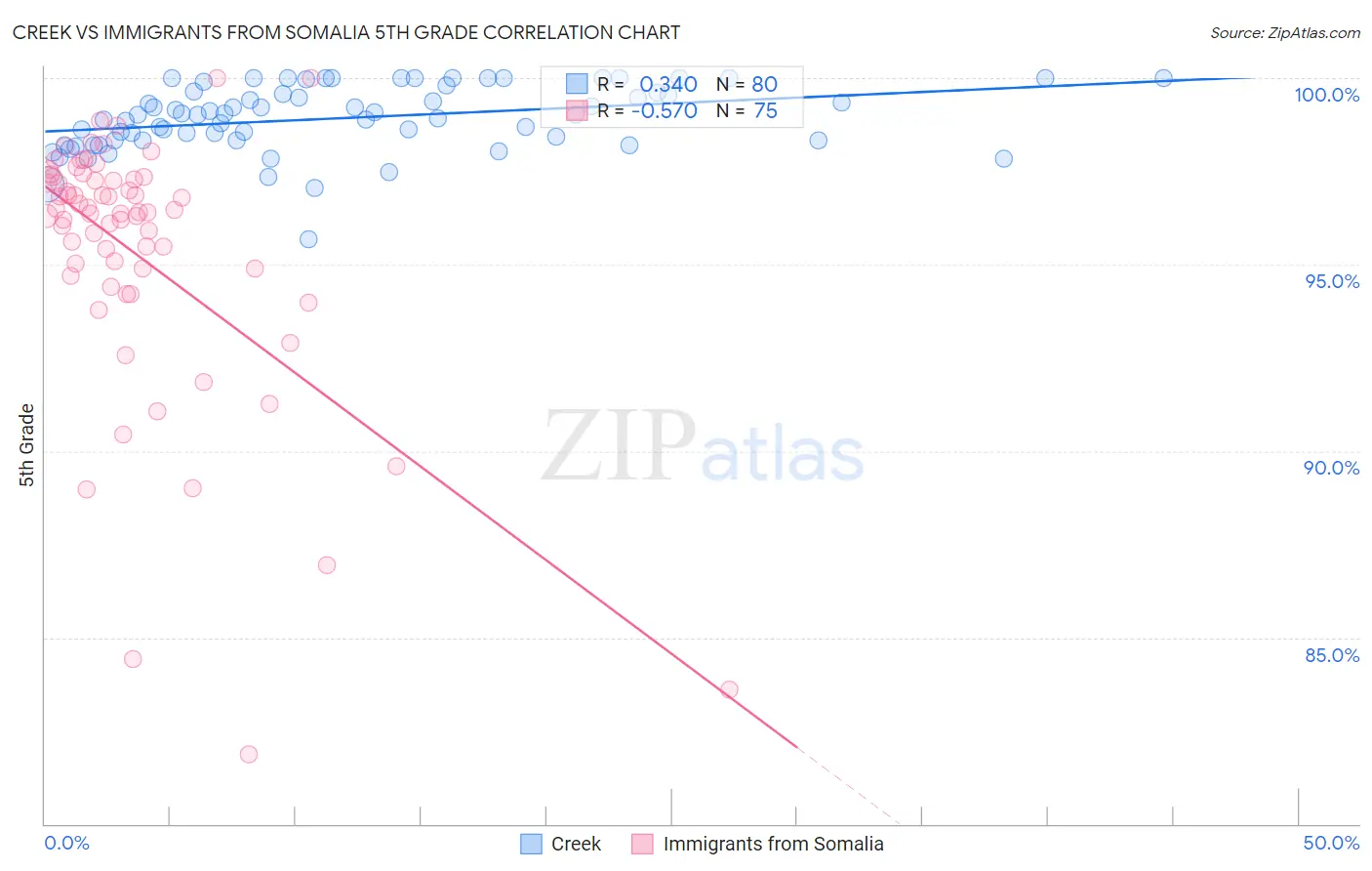 In terms of 5th grade, the demographic groups most similar to Creek are Greek (97.9%, a difference of 0.0%), Austrian (97.9%, a difference of 0.0%), Slavic (98.0%, a difference of 0.010%), Australian (98.0%, a difference of 0.010%), and White/Caucasian (97.9%, a difference of 0.010%).