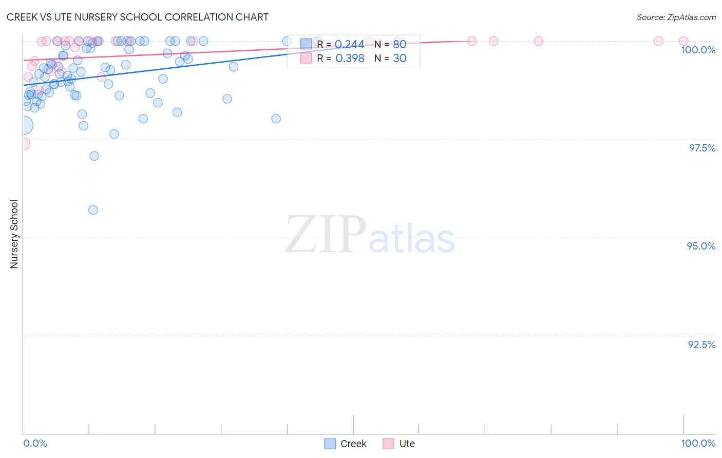 In terms of nursery school, the demographic groups most similar to Creek are Immigrants from Canada (98.4%, a difference of 0.0%), Slavic (98.4%, a difference of 0.0%), New Zealander (98.4%, a difference of 0.0%), Immigrants from North America (98.4%, a difference of 0.0%), and Greek (98.4%, a difference of 0.0%).